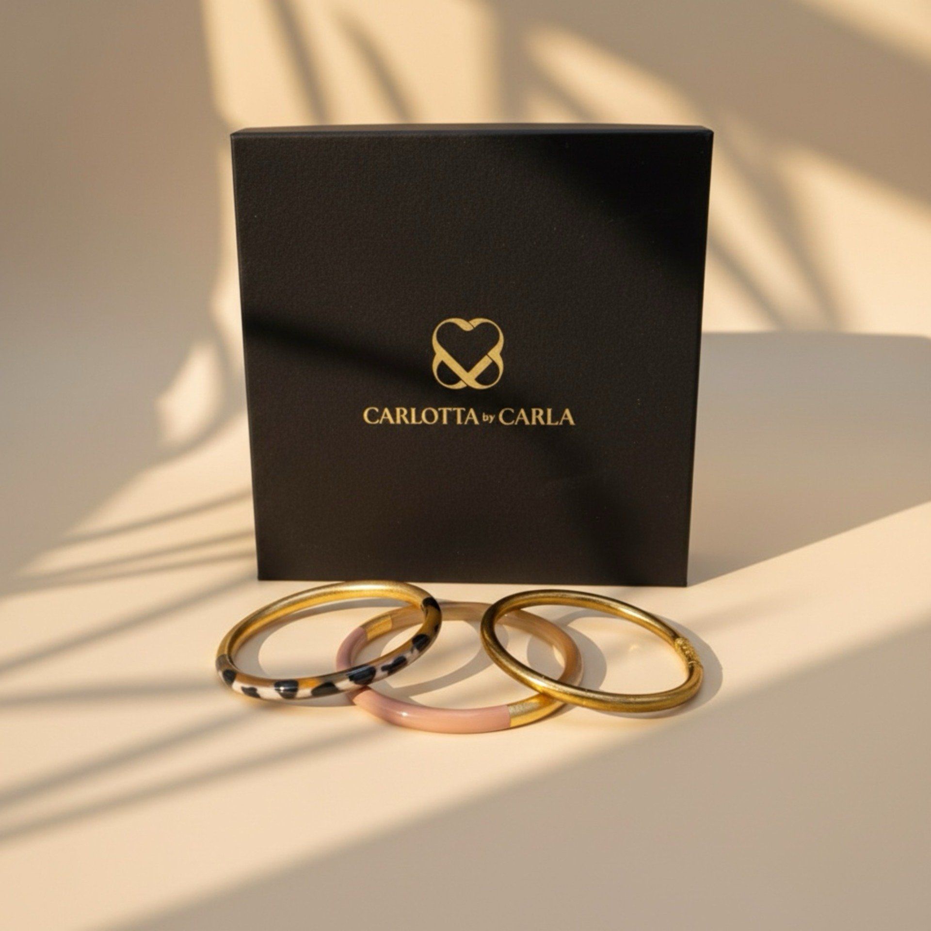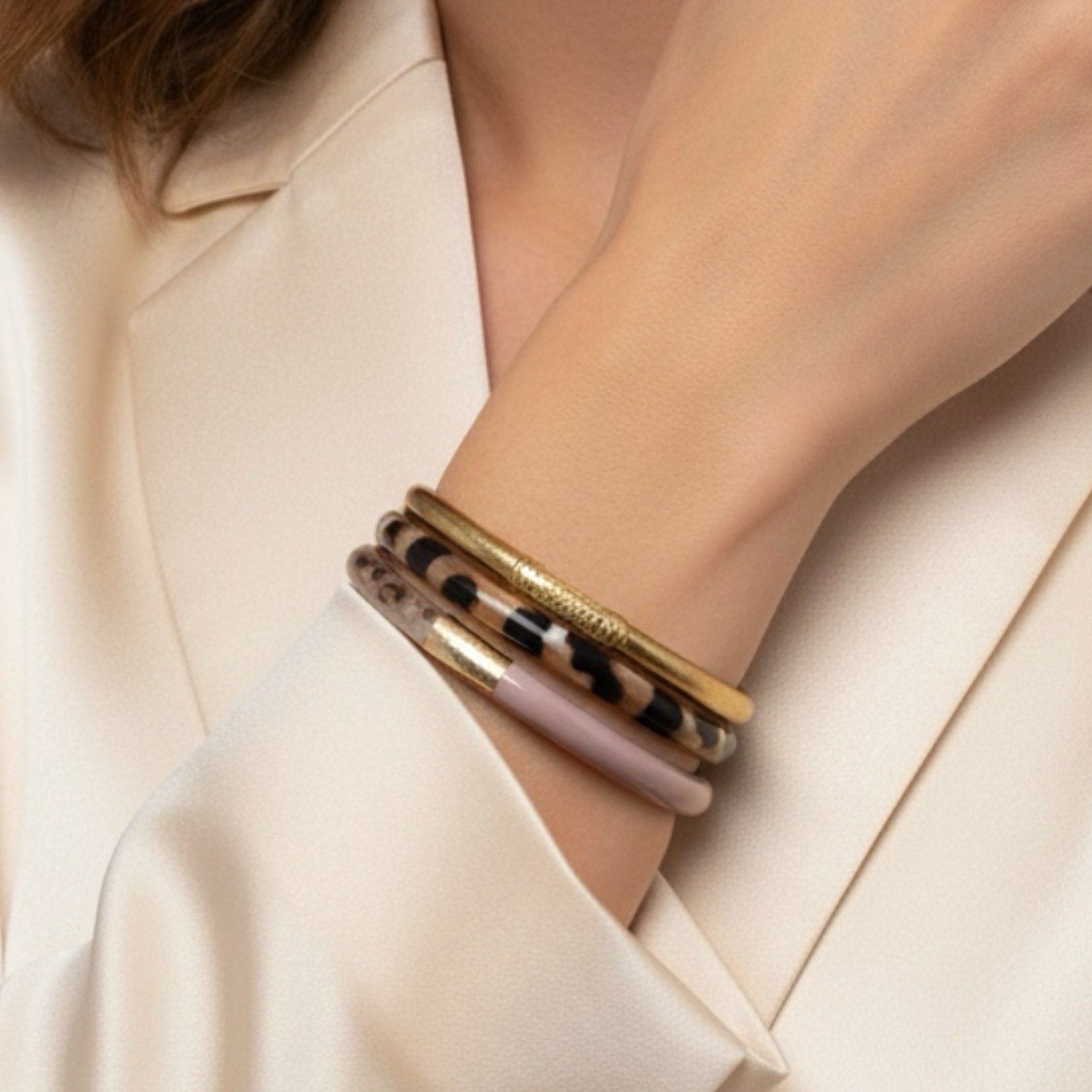 – un bracelet en corne véritable rehaussée de feuille d’or nude, incarnant la féminité, la douceur et l’acceptation de soi