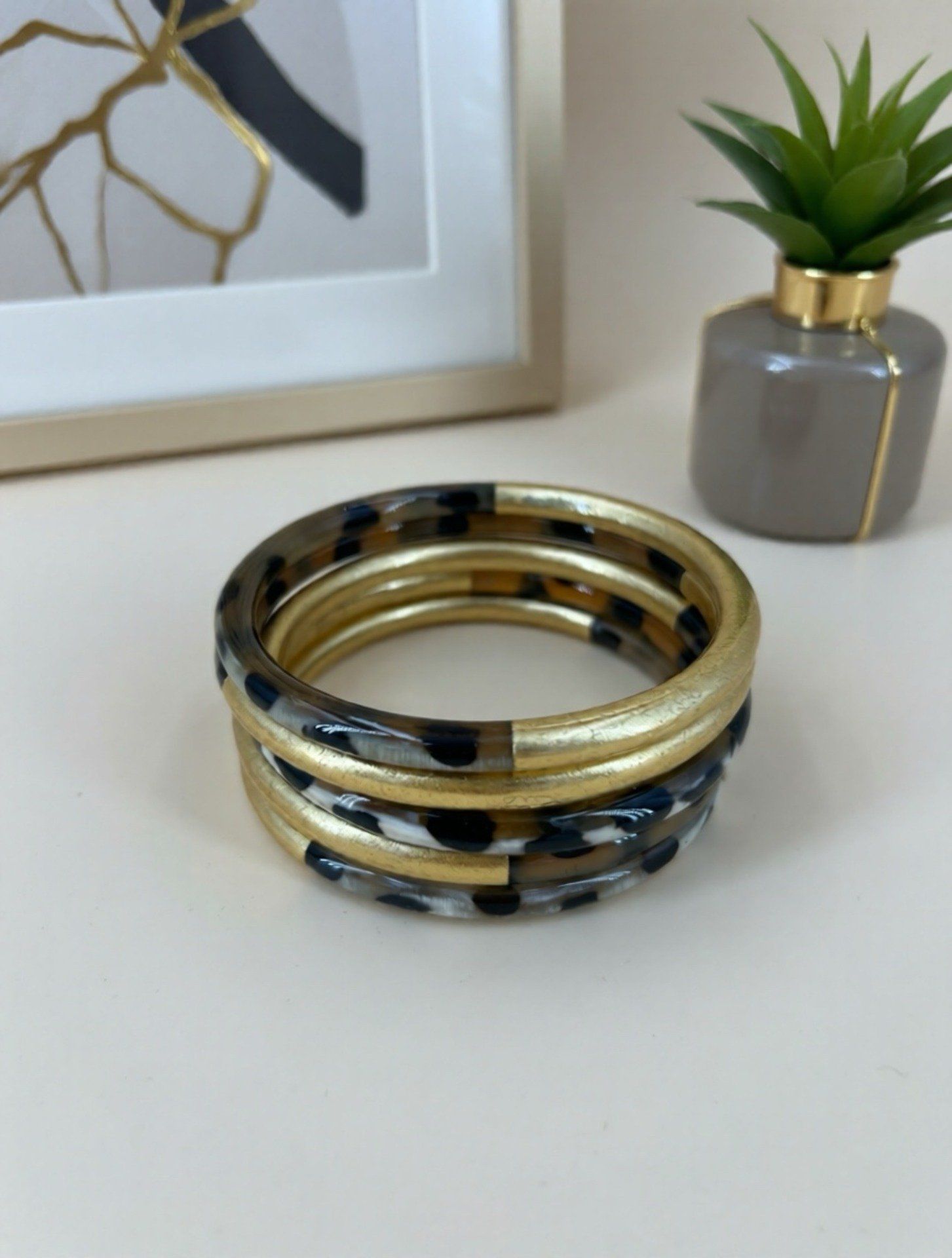 les bracelets en corne véritable, sublimés par de délicates feuilles d’or, incarnent la rencontre entre force naturelle et lumière. La corne, matière organique et vivante, est associée à la protection et à l’ancrage, tandis que l’or symbolise l’éclat, la préciosité et l’énergie solaire.