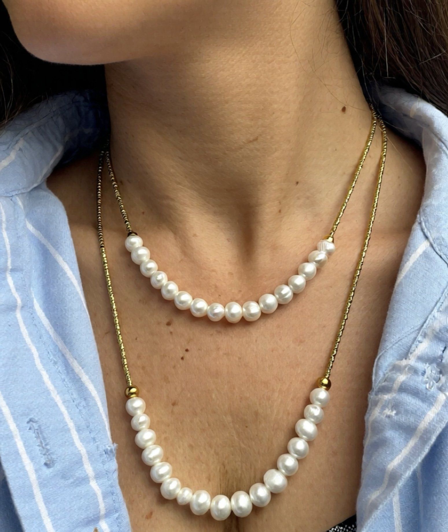 Il associe la finesse des perles japonaises Miyuki dorées à la pureté naturelle des perles de culture d’eau douce blanches, sélectionnées pour leur éclat lumineux et leurs vertus énergétiques.