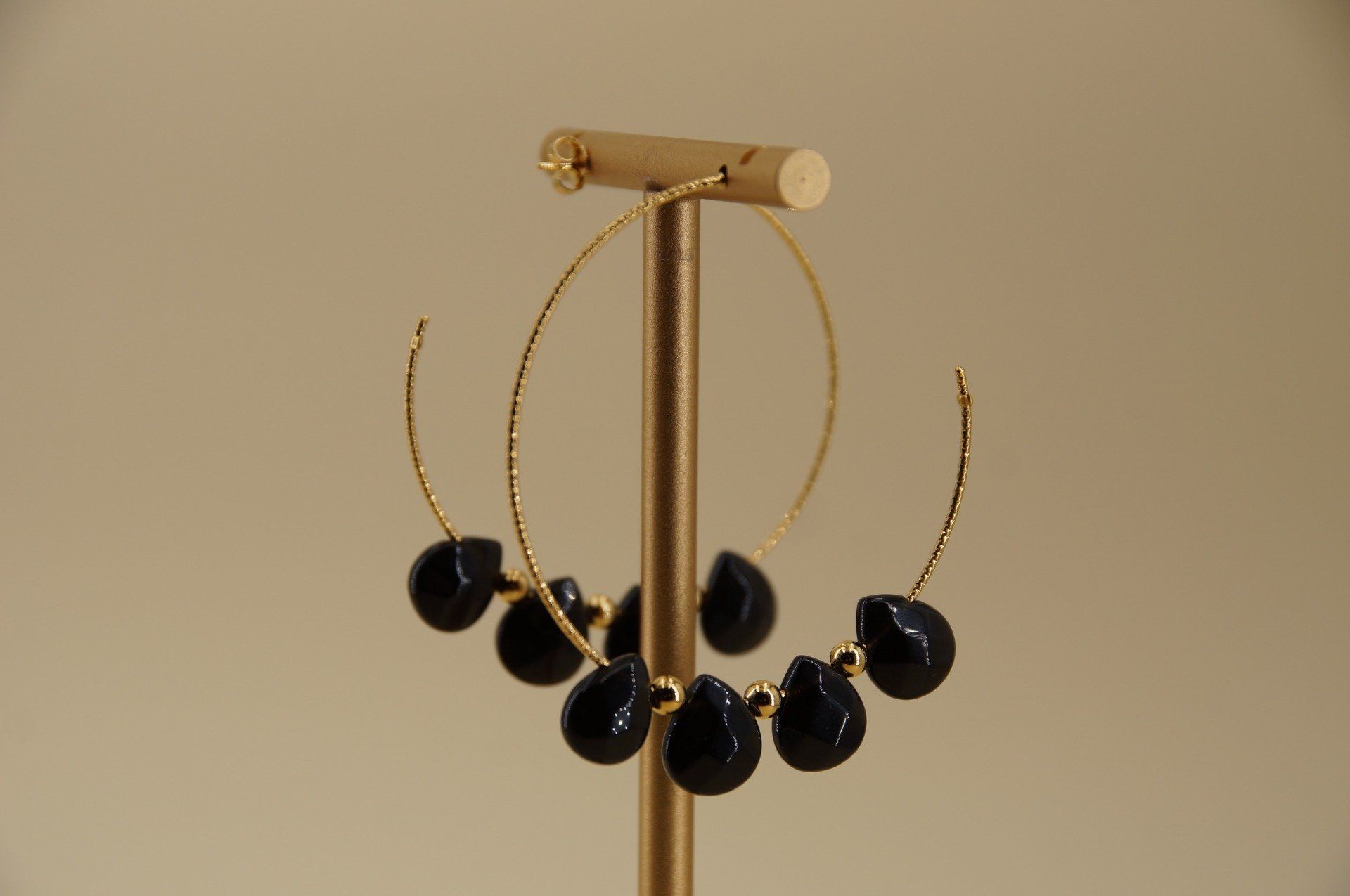 Elles sont ornées de pierres fines d’onyx noire en goutte diamantée, profonde et lumineuse, qui capte la lumière avec subtilité.