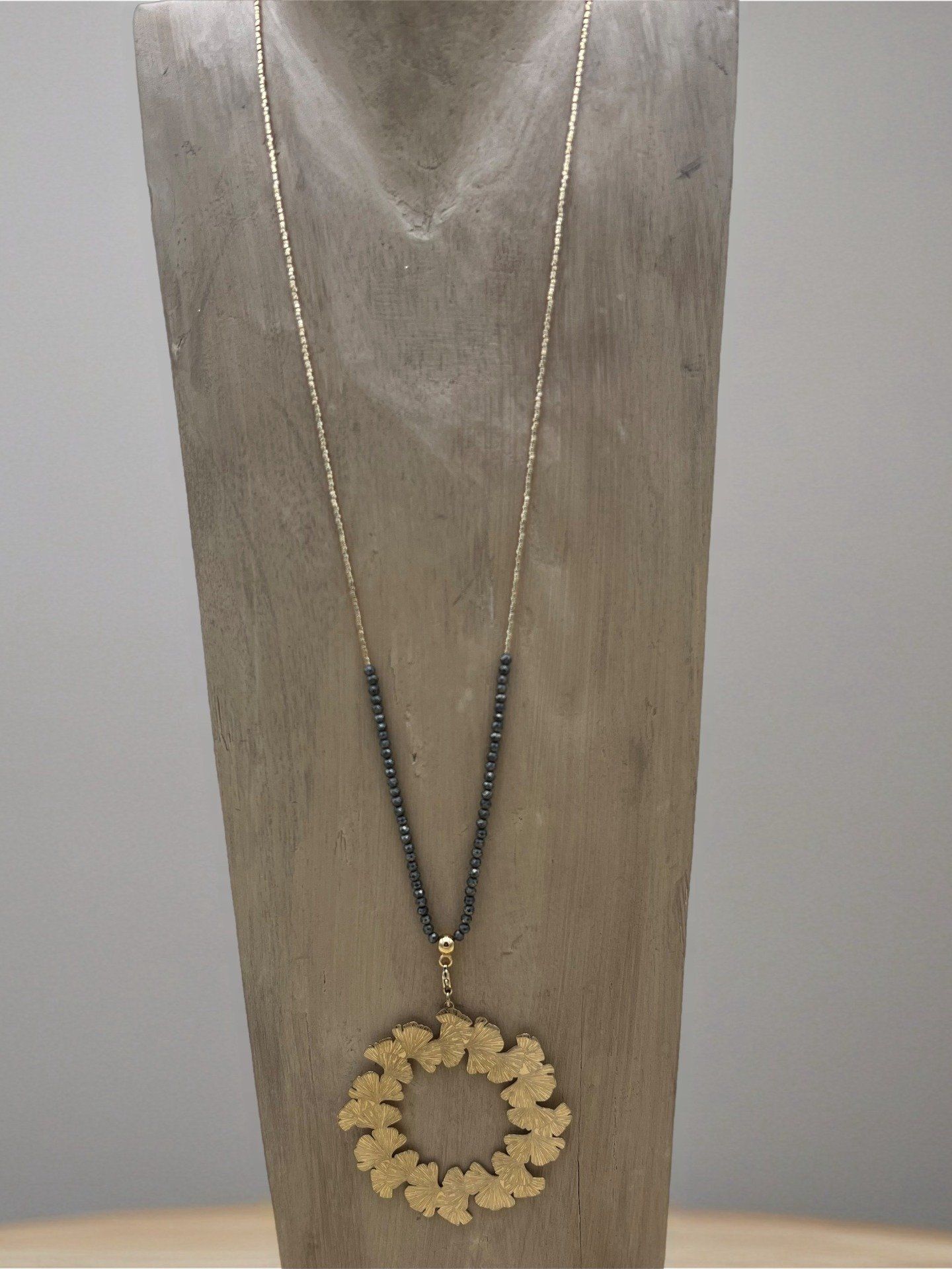 Inspiré du Ginkgo, arbre sacré et millénaire, symbole de longévité, de renouveau et de protection, ce sautoir a été pensé comme un bijou magique et profondément énergétique.