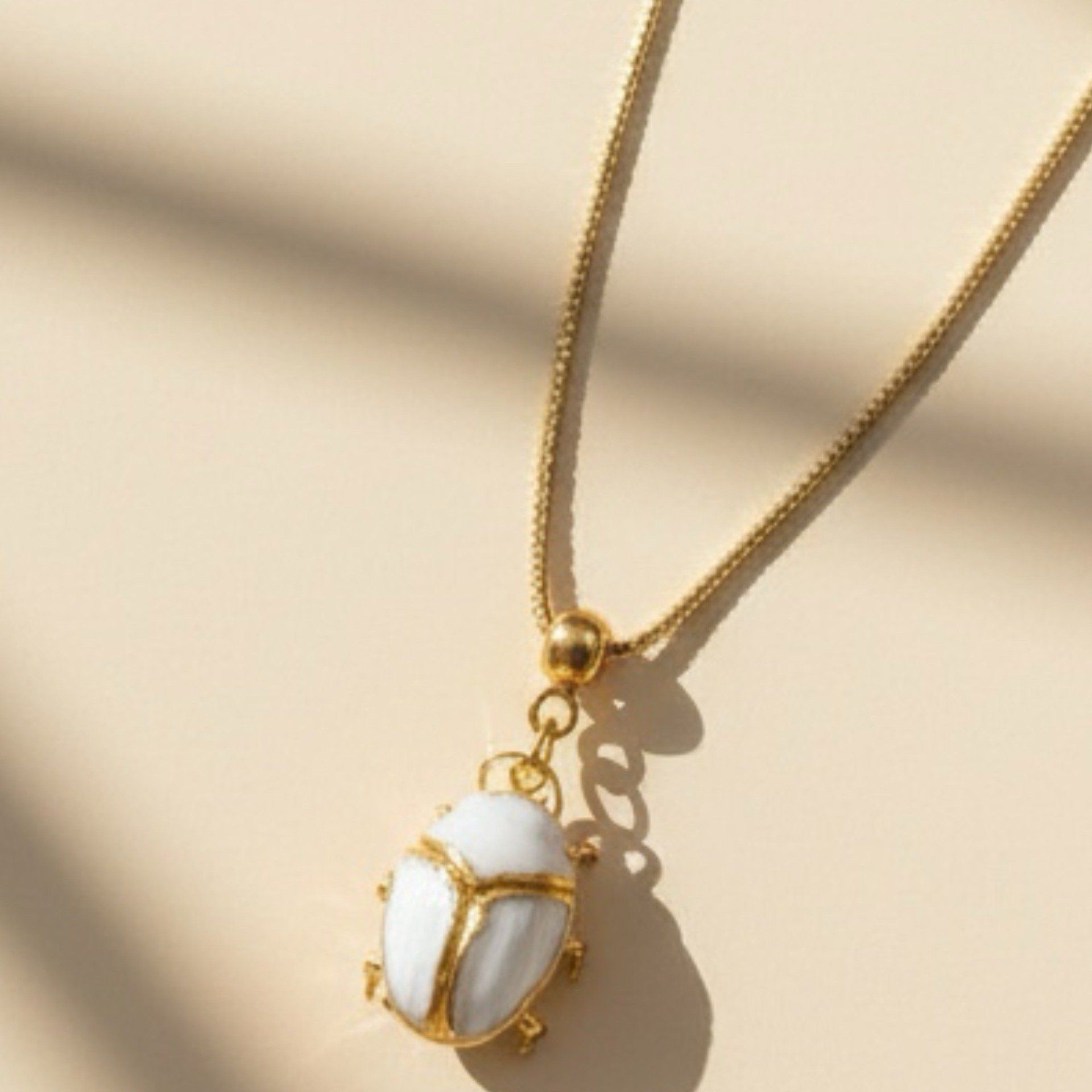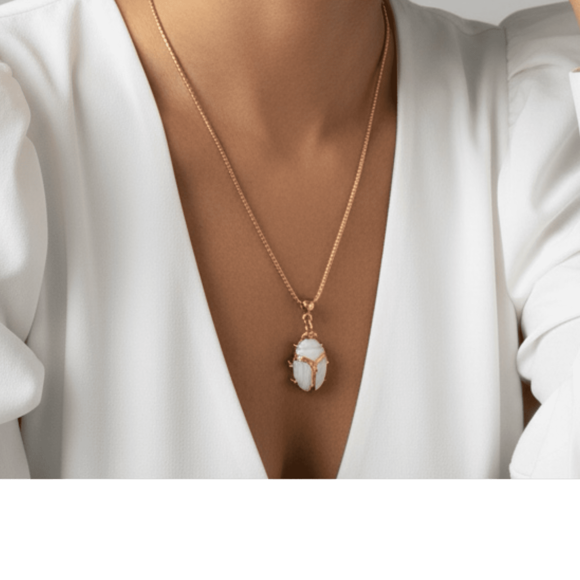 Pensé pour tomber naturellement sur le décolleté, ce collier met en lumière le scarabée avec élégance et équilibre.