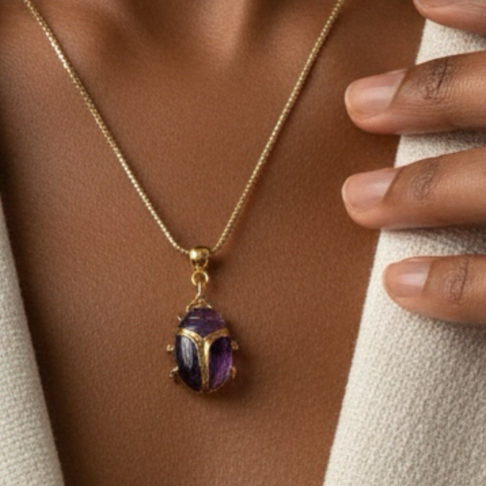 Pensé pour tomber naturellement sur le décolleté, ce collier met en lumière le scarabée avec élégance et équilibre.